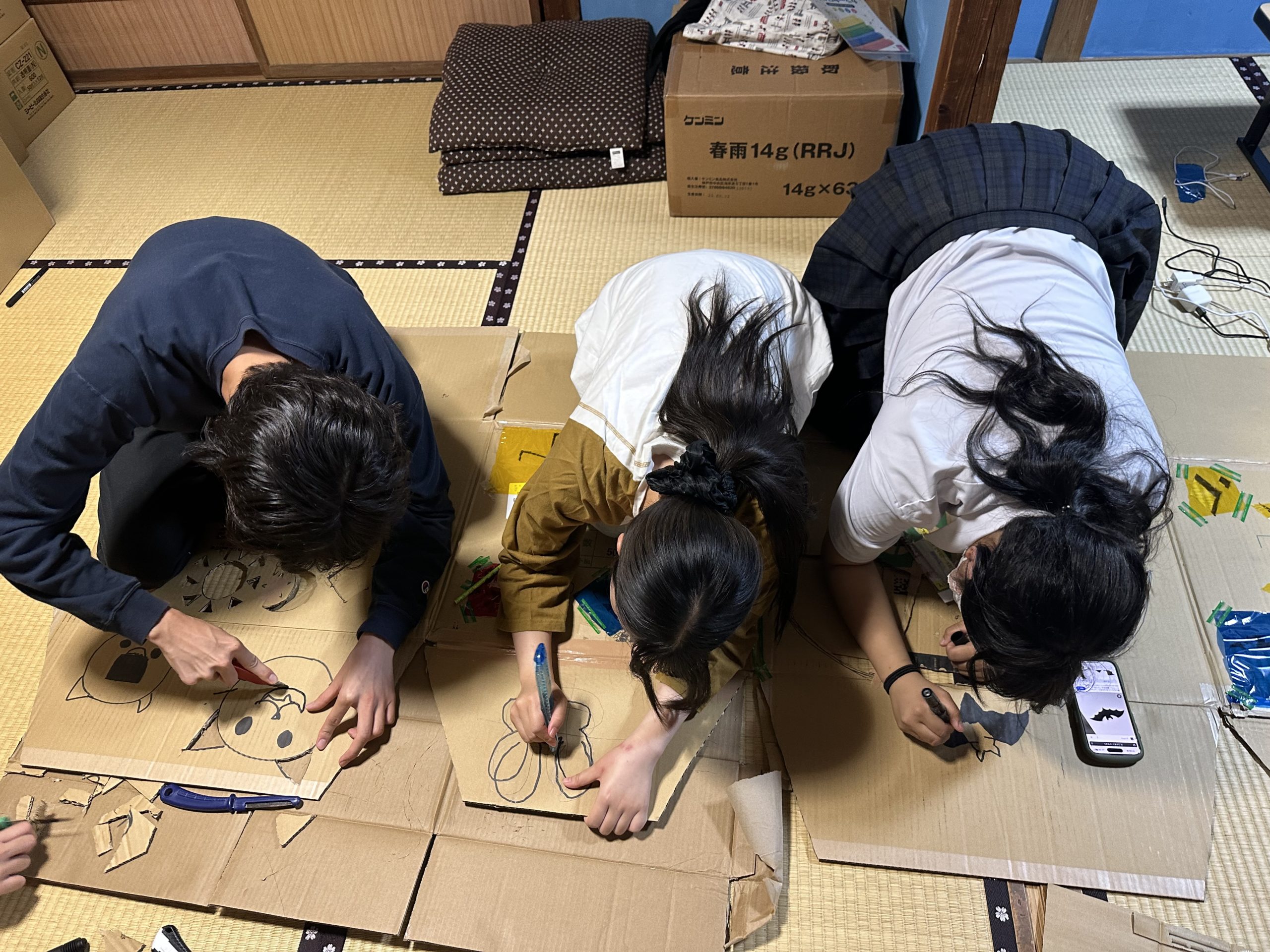 学習支援のボランティアさん達にもお手伝いいただきながら、段ボールをくり抜いたり、カラーセロハンを貼ったりと、みんなで力を合わせて世界にひとつだけの作品が完成しました😊